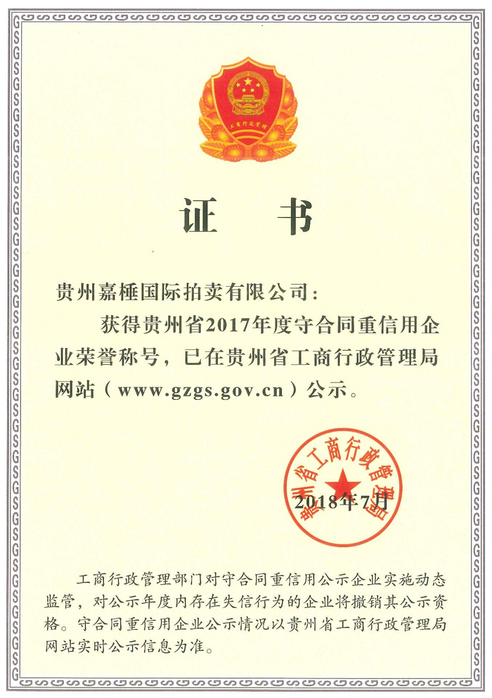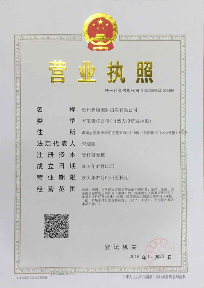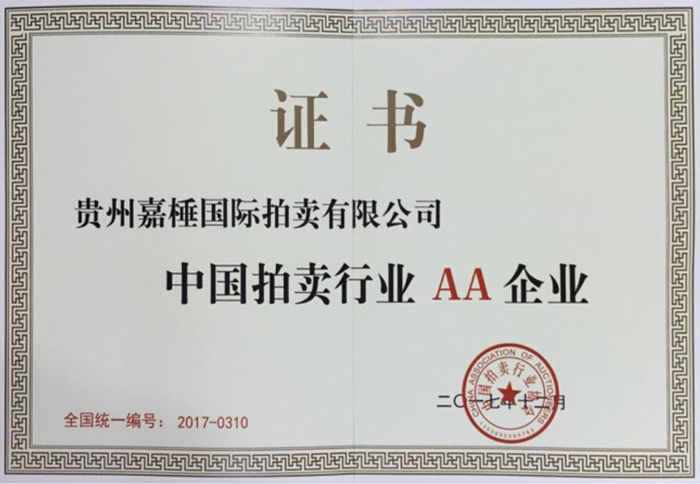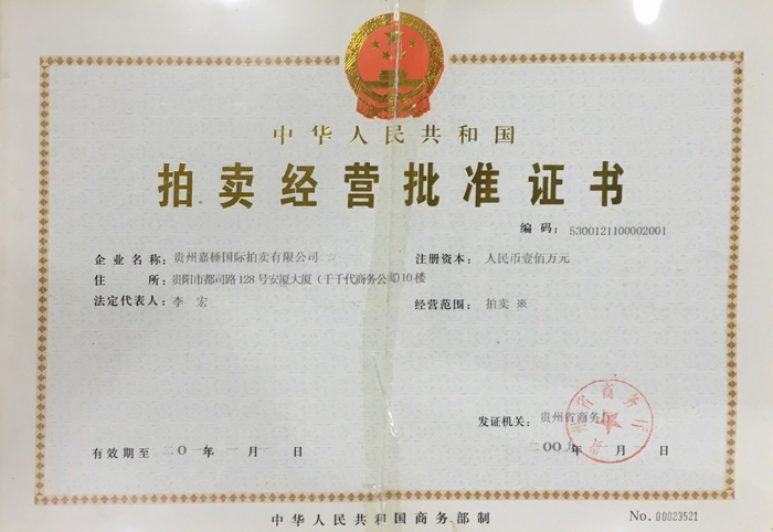 貴州嘉棰國際拍賣有限公司是主要從事動產、不動產、無形資產和文物藝術品拍賣業務的大型綜合性拍賣企業,是中國拍賣行業協會會員,貴州省拍賣行業協會理事單位,中國拍賣行業協會AA級資質企業,貴州省連續(xù)十一年重合同守信用企業,全省拍賣先進企業,貴州省公物拍賣人。公司充分利用多年來積累的客戶資源和全新的經營理念服務于貴州經濟發(fā)展。同時也為貴州省國有企業的資產重組、改制改造以及不良資產的變現,起到積極的作用。貴州嘉棰國際拍賣有限公司自成立以來,多次成功地組織了房產、土地、機器設備和各種物資等標的拍賣。并于2001年12月成為第一批貴州省高級人民法院及多家金融機構指定的拍賣企業。 公司下設產權部、市場發(fā)展部、財務部、人事部和辦公室。現有員工11名,大專以上學歷員工占總數的90%,擁有精通業務的專門人才。有國家注冊拍賣師3名,公司工作人員大多參加過中國拍賣行業協會組織的從業資格培訓。公司堅持“客戶至上,執(zhí)業嚴謹,公平競.....